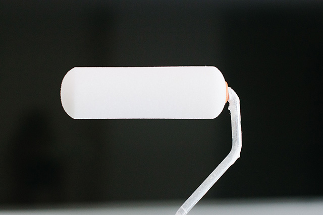 Lay down your stencil across the 4 tiles and use blue tape to secure it while you roll on the paint. You don't need to pound the roller into the tile, just be gentle and make sure it's all covered. Go slow to avoid splatter!